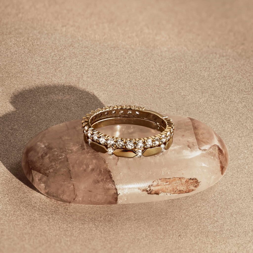 Choisissez le même métal (or jaune, blanc ou rose) ou optez pour un bicolore qui harmonise les deux teintes. Si la bague de fiançailles est sertie de diamants, une alliance pavée ou à motif discret crée une continuité élégante.